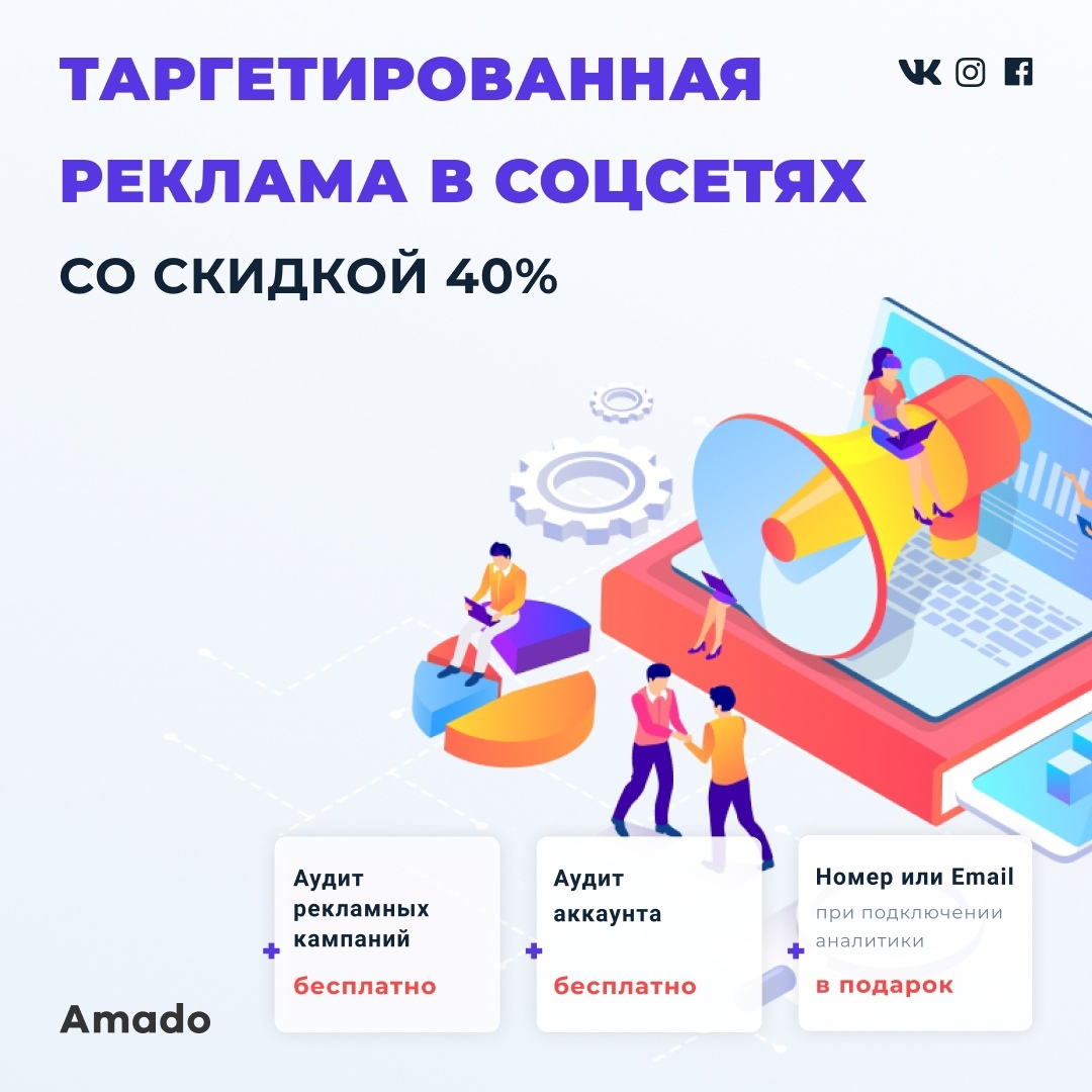 Аудит текущей рекламы и аккаунтов в соцсетях — В ПОДАРОК. Также при подключении аналитики дарим подменный номер телефона или email. |