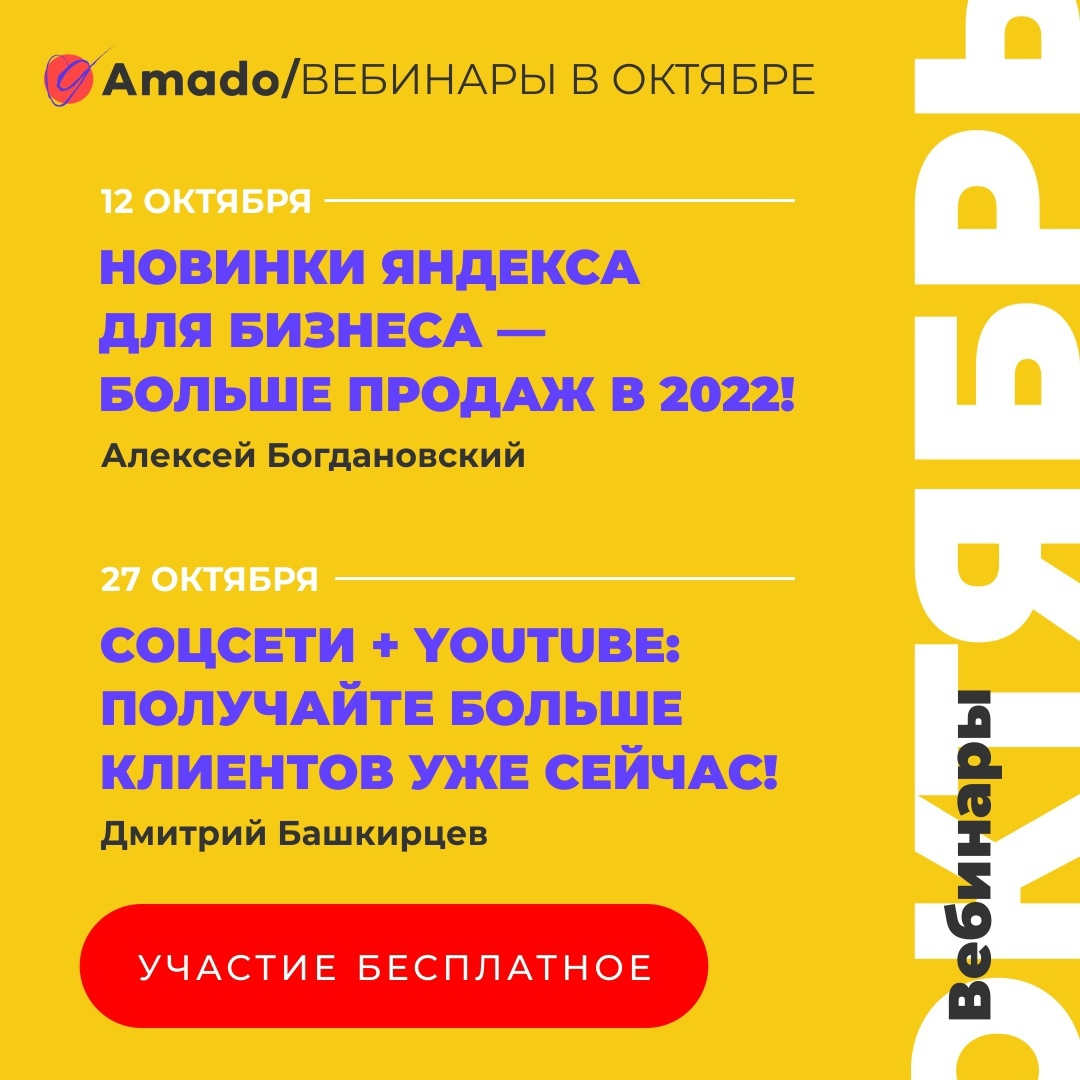 Представляем вашему вниманию календарь полезных вебинаров от «Амадо» в этом месяце, на которых мы разберём актуальные вопросы интернет-продвижения и поделимся реальными кейсами по продвижению производственных и оптовых компаний, брендов и сетевых магазинов с полученными результатами. | | | | Только практическая информация от экспертов онлайн-продвижения в сложных сферах | | | | | Алексей Богдановский | | Эксперт по обучению Яндекса, совладелец интернет-агентства полного цикла «Амадо», преподаватель курса интернет-маркетинга, контекстной рекламы и веб-аналитики. | | | | Дмитрий Башкирцев | | Руководитель отдела продвижения в соцсетях «Амадо», эксперт, спикер на профильных семинарах, преподаватель на курсах интернет-маркетинга. | | | | | тут можно добавить блок со ссылками на записи прошедших вебинаров | | | | | | | | Если вы не хотите получать письма от нас на этот адрес, нажмите на ссылку отписки в конце письма. | | | |