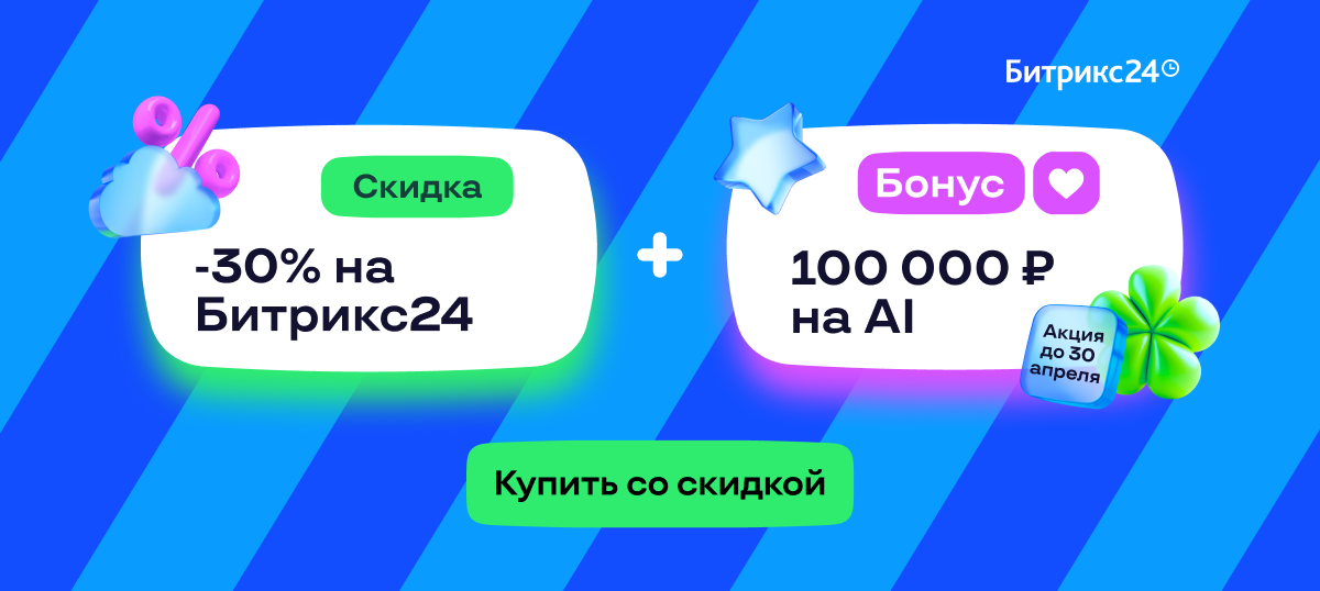 | | | | Скидка 30% на годовой тариф Битрикс24 | | | | На платных тарифах клиенты получают: | | | | | Мощную CRM, которая ускоряет сделки, возвращает клиентов и стимулирует повторные продажи. | | | | Автоматизацию бизнес-процессов для избавления от рутины и экономии ресурсов. | | | | КЭДО, позволяющий отказаться от бумажного документооборота в компании. | | | | Цифровые места, создающие условия для повышения производительности сотрудников. | | | | Права доступа для надежной защиты данных. | | | | Расширенные инструменты сервиса, с помощью которых создаётся суперэффективное пространство для улучшения командного взаимодействия, прозрачности процессов и роста продаж. | | | | | Бонус 100 000 ₽ на AI-помощника для бизнеса | | | | Вместе с новыми инструментами выбранного тарифа до 30 апреля вы получаете Copilot с количеством запросов на 100 000 рублей.